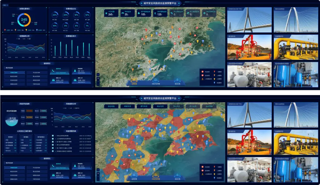 整合桥梁、燃气、供排水、热力及综合管廊等多类监测数据,预警信息集中展示,一屏掌握城市安全动态。