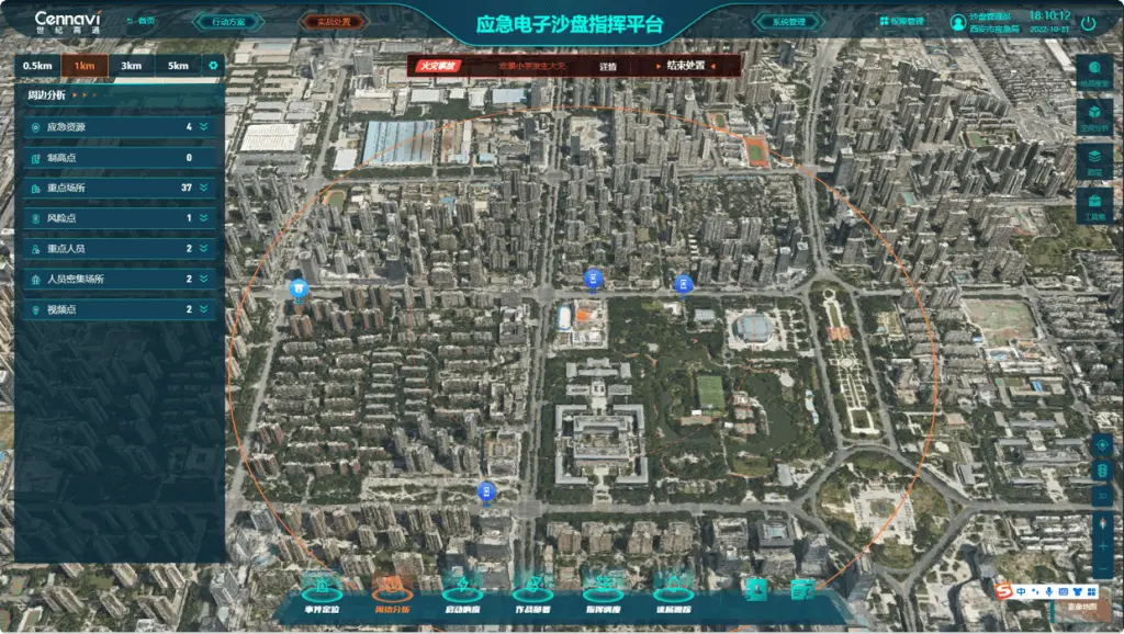 借助预警/告警点精准定位,结合周边态势分析、模型推演、任务部署及资源统筹,全面支撑突发事件应对全过程。